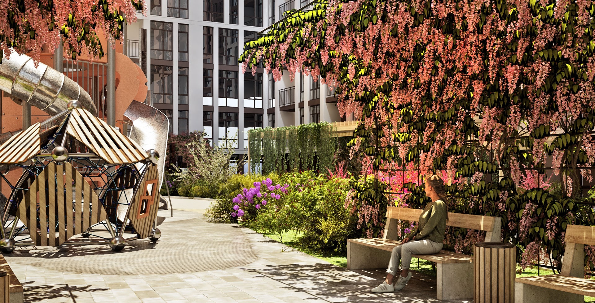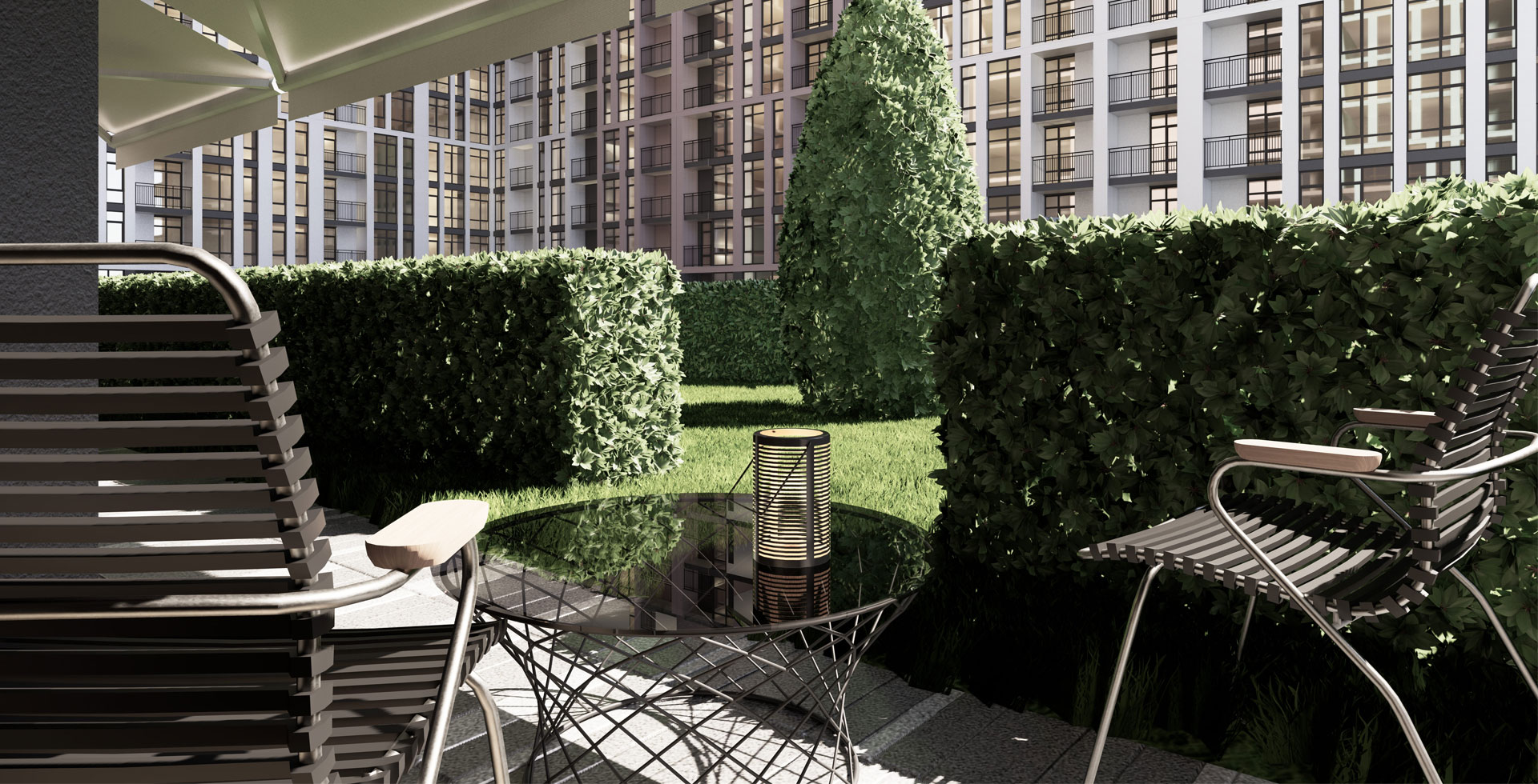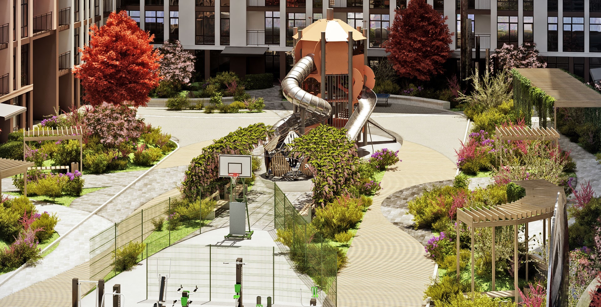Внутрішні двори житлового комплексу будуть облаштовані авторськими тихими зонами відпочинку, сучасними ігровими та воркаут майданчиками.