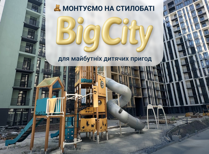 На стилобаті першого будинку вже монтують дитячі майданчики — і це більше, ніж просто гойдалки.